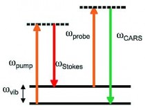 相干反斯托克斯拉曼光谱也称作相干反斯托克斯拉曼散射光谱(CARS) 是一种主要用于化学和物理及相关领域的光谱技术。和拉曼光谱类似其对于分子相同的振动能级特征,典型的是化学键的原子间振动,具有较高的检测灵敏度。和普通拉曼光谱学不同的之处在于,CARS 采用多个光子协同工作共同来检测分子的振动特性,因此其产生的信号光子之间彼此具有相关性。于是CARS信号强度通常比自发拉曼散射信号要高若干个量级。 CARS 是一种涉及三路激光束的三阶非线性光学过程: 一路频率为 ω pump的泵浦光,一路频率为ω Stokes 的斯托克斯光和一路频率为 ω probe的探针光. 这些路激光和样品相互作用并产生一路相干光学信号,其频率处于反斯托克斯位置: ω CARS = ω pump - ω Stokes + ω probe. 当泵浦光 ω pump 和斯托克斯光ω Stokes 频率之差接近分子某个振动跃迁频率 ω vib 时,CARS 信号ω CARS会发生共振增强。 Combining of coherent anti-Stokes Raman scattering (CARS) spectroscopy with the microscopy opens up unique method for chemical imaging. CARS microscopy permits vibrational imaging with high-sensitivity, high speed, and three-dimensional nearly diffraction limited spatial resolution.  |